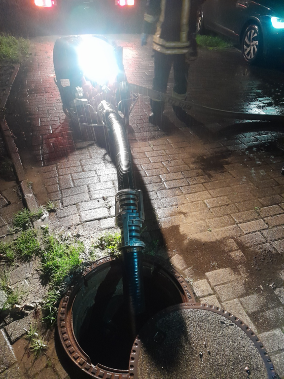 Wir begannen den Kanal abzupumpen um ihn zu entlasten, da es schon in dem Nachbar Gebäude anfing aus der Dusche hochzukommen. Ein eingreifen war unsererseits dort allerdings nicht notwendig.